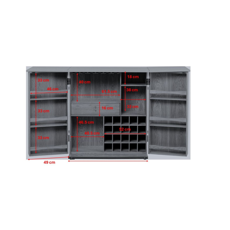 | Materiais : | Corpo: Painel de fibras de média densidade (MDF) lacado a tinta, Porta-vinhos: Contraplacado de freixo folheado, Ferragens: Aço |