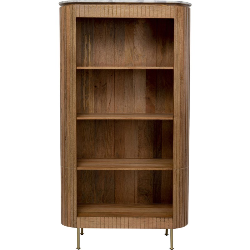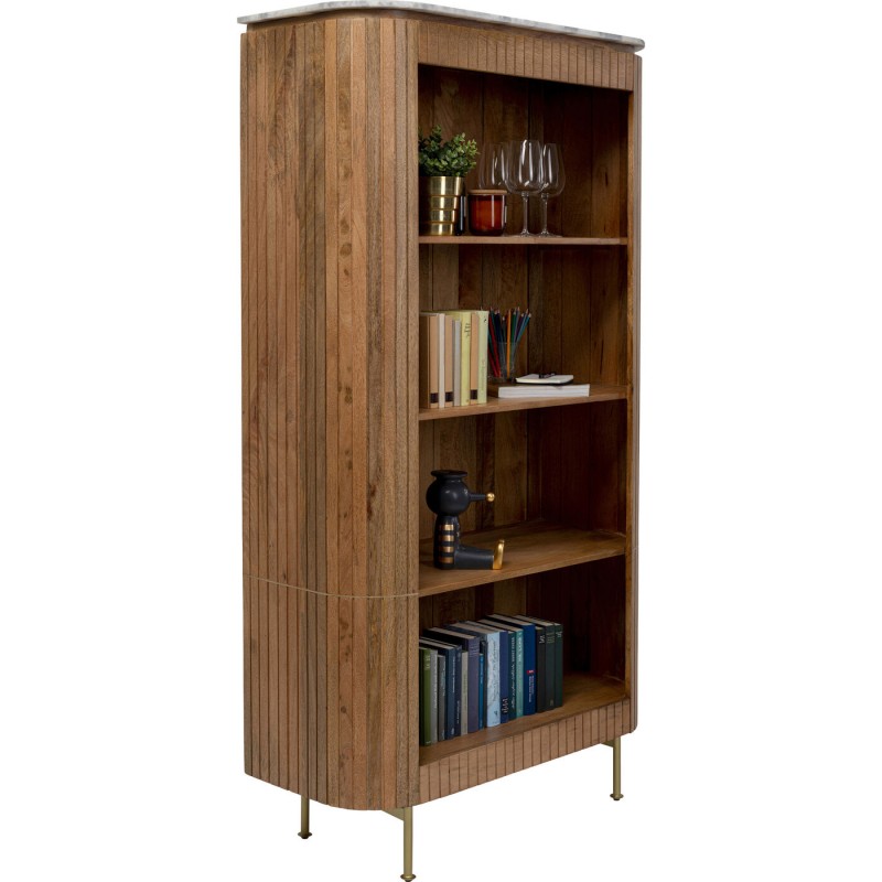 Os modelos da coleção Grace introduzem harmonia na sala de estar com as suas curvas suaves. A isto acresce a composição de material elegante de madeira maciça e mármore. Por outro lado, a coleção joga com as superfícies, como aqui com as secções estruturadas e lisas das frentes de madeira. Uma discreta guarnição cor de latão coroa o design desta estante excecionalmente atraente. Livros, vasos ou objetos de arte são exibidos da melhor forma nesta estante de madeira. Elegante estante independente de madeira com detalhes luxuosos, 190 x 100 x 40 cm (A/L/P). Uma estante artesanal de alta qualidade. As quatro prateleiras, também em madeira maciça, são fixas. Madeira de mangueira maciça, mármore verdadeiro para o tampo e aço galvanizado são os materiais em destaque Existem corrediças reguláveis em altura nos pés