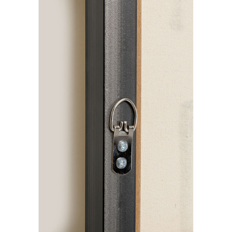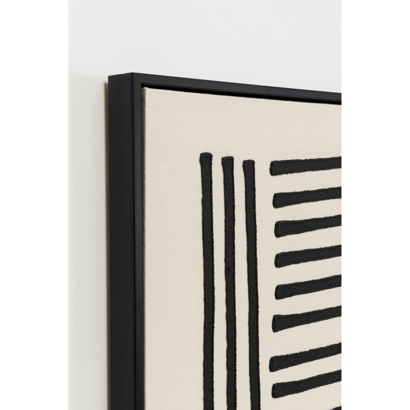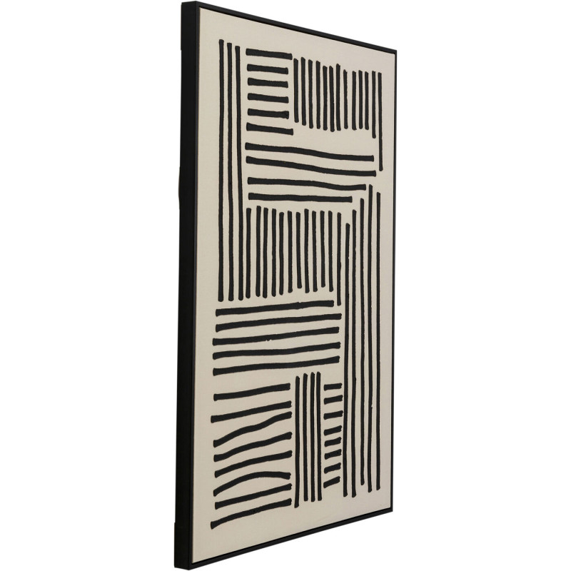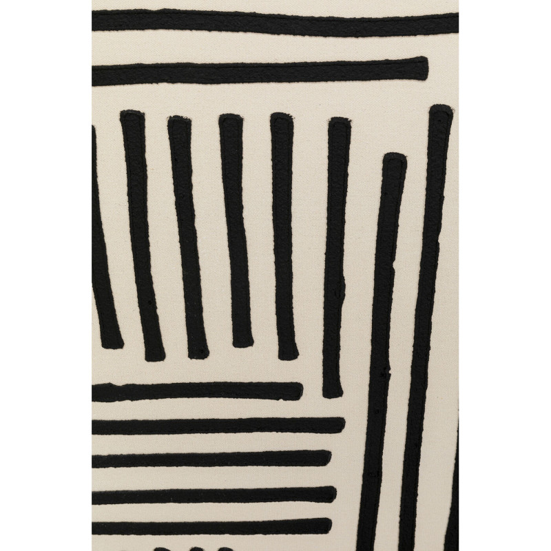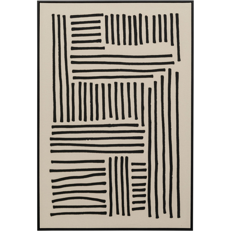 Esta pintura de estilo étnico é composta por numerosas linhas pretas em relevo sobre um fundo creme em várias direções, dando-lhe um aspeto de zebra.