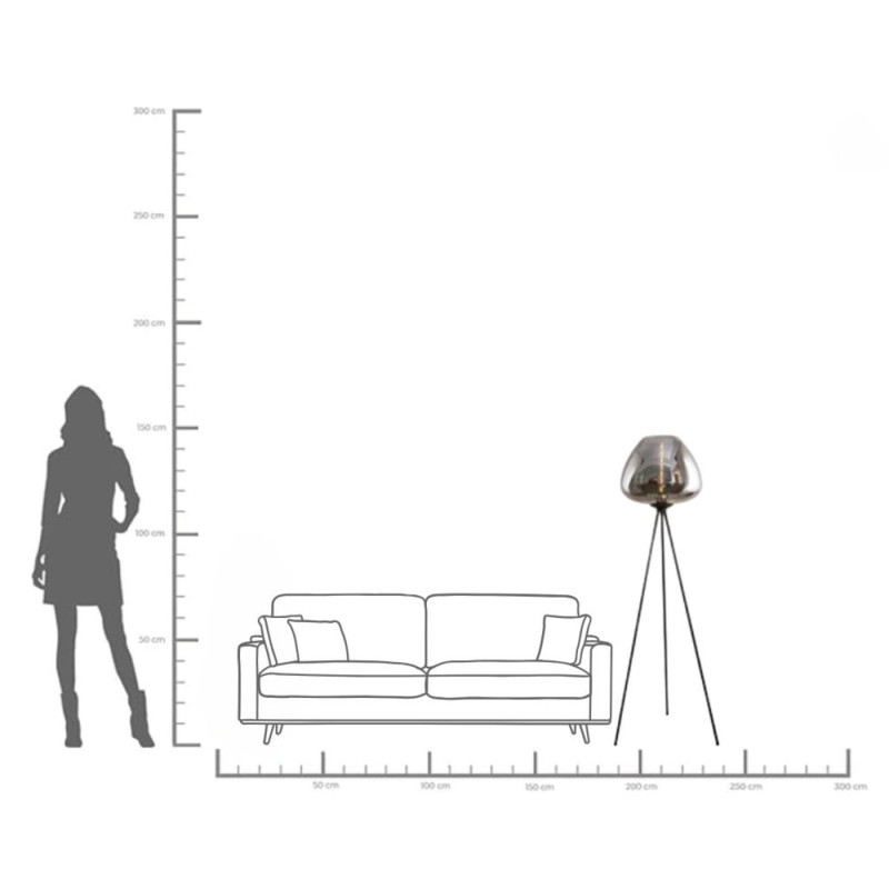 Ilumine o seu espaço com este candeeiro de pé moderno. Possui três pés pretos e um abajur em vidro fumado que difunde uma luz suave.